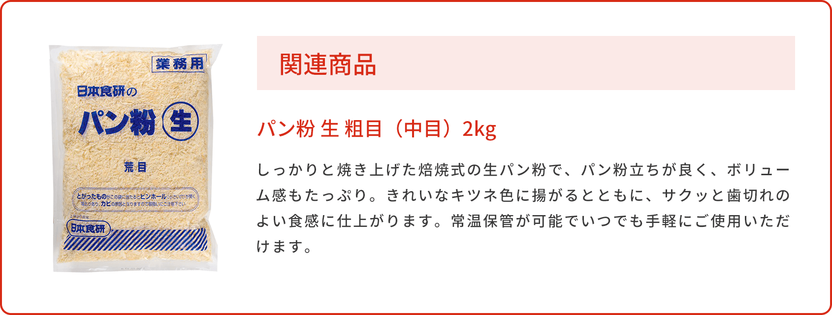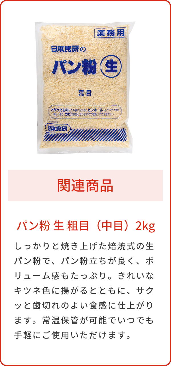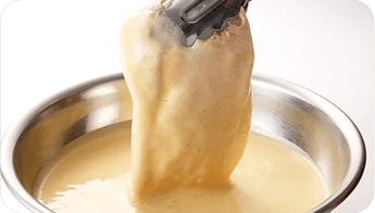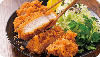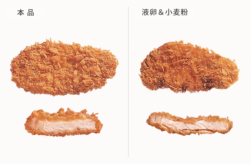 フライ時も衣が素材から離れないので、肉汁を逃さず、ボリュームのある柔らかくてジューシーな揚げ物が簡単にできます。
