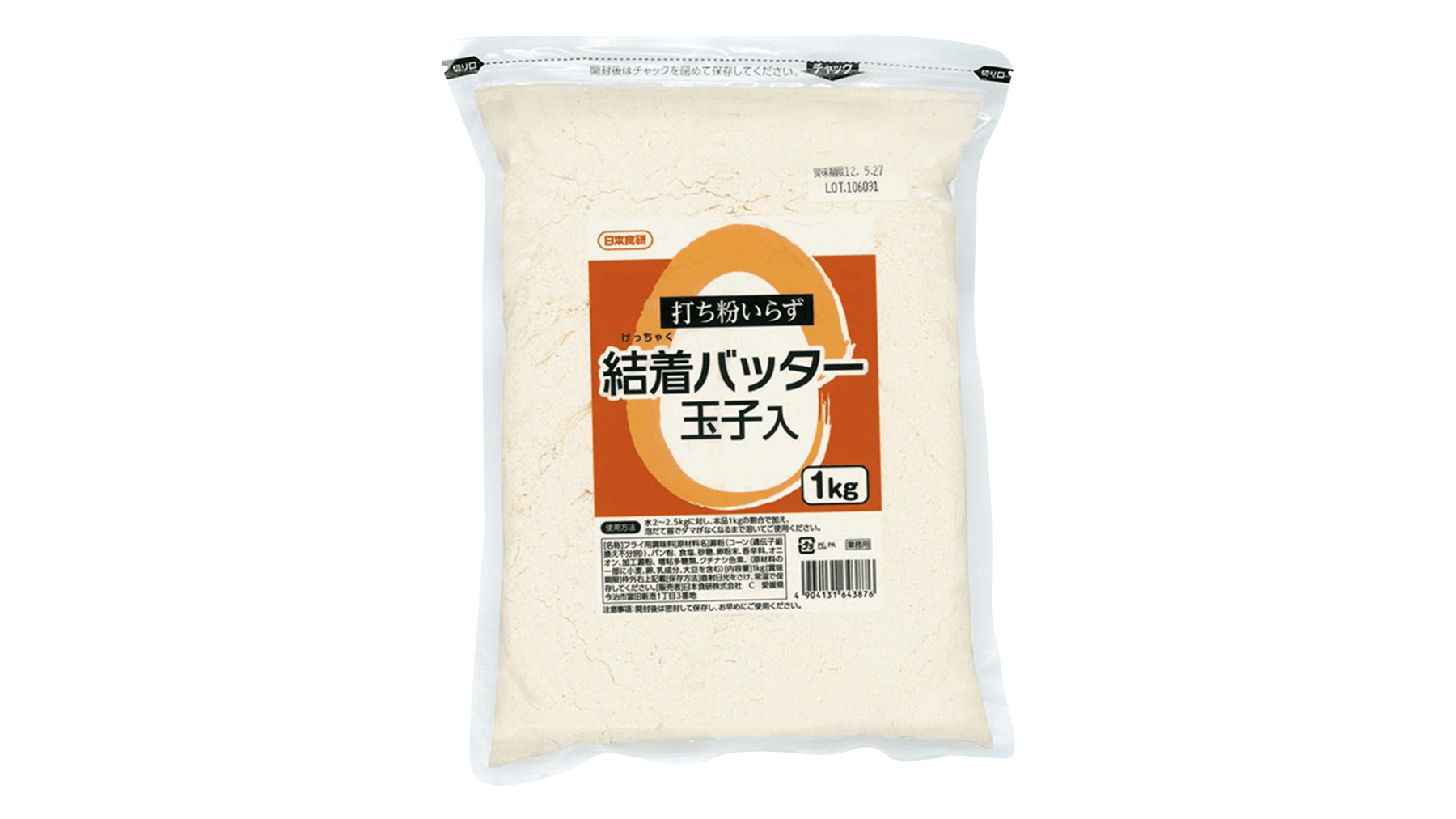 衣はがれは揚げ物の天敵。本品を水溶きして素材をくぐらせるだけで、打ち粉をしなくても、しっかりくっつく機能性。揚げ物がジューシーに、カット面も見栄え良く仕上がります。