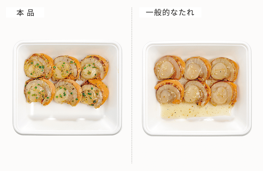 オイルが素材をしっかりコーティングし、水分や旨味を逃しません。調理の前にからめたまま長時間置いてもドリップが出ないので、加熱してもパサつかずおいしく仕上がります。