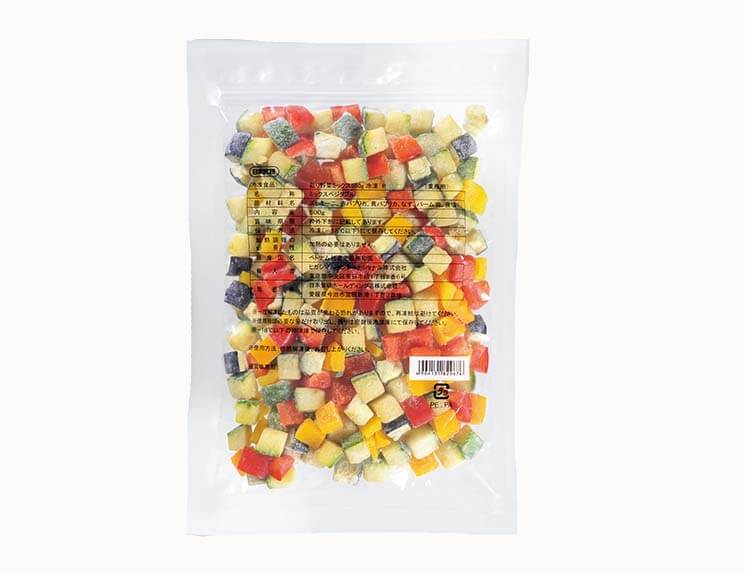 4種の彩の良い野菜(ズッキーニ、赤・黄パプリカ、なす)を一口大にカットし、バラ凍結しています。
