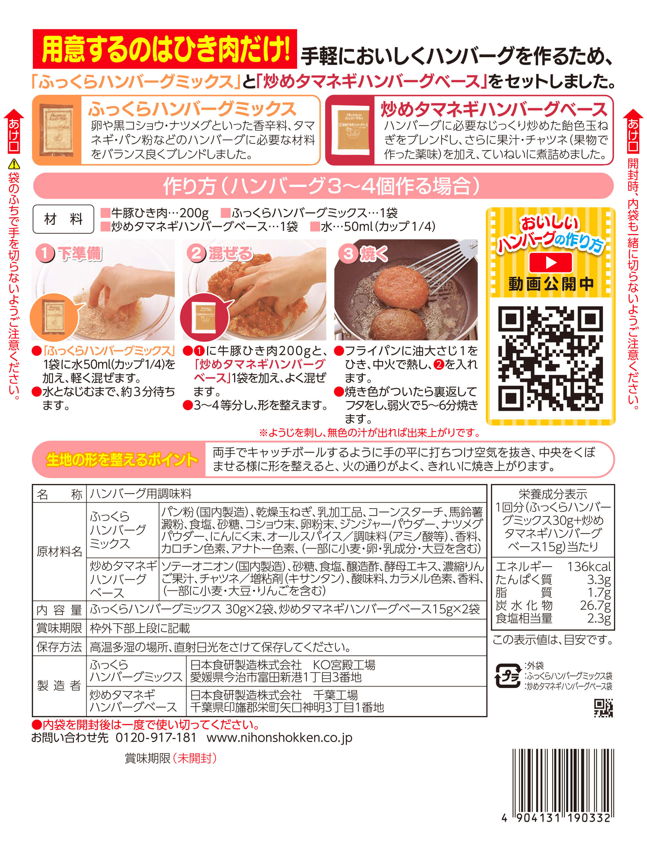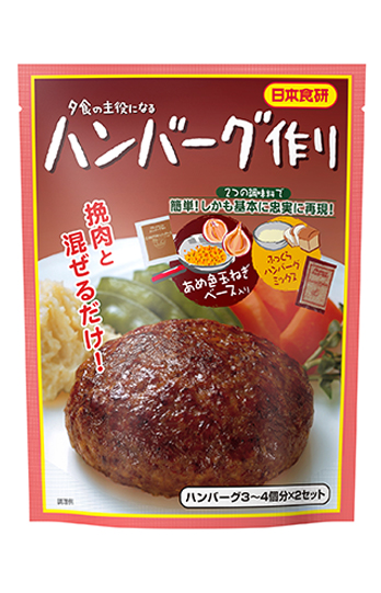 【ふっくらハンバーグミックス】パン粉(国内製造)、乾燥玉ねぎ、乳加工品、コーンスターチ、馬鈴薯澱粉、食塩、砂糖、コショウ末、卵粉末、ジンジャーパウダー、ナツメグパウダー、にんにく末、オールスパイス/調味料(アミノ酸等)、香料、カロチン色素、アナトー色素、(一部に小麦・卵・乳成分・大豆を含む)