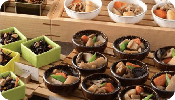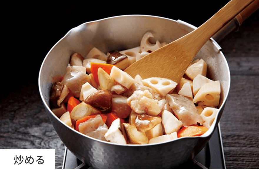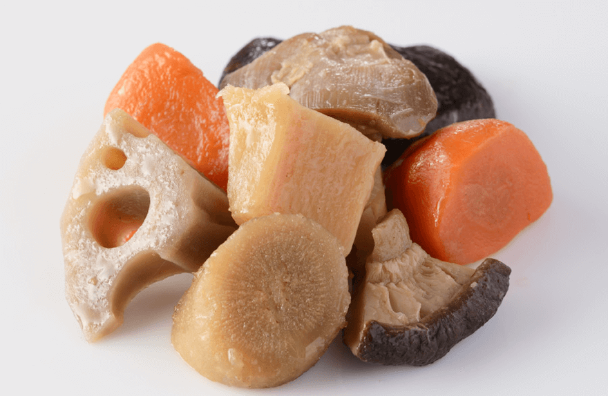 食感や風味を引き出すため、存在感のある大きめサイズにカット。また、素材ごとに最適な加熱時間で調理しています。(人参、鶏もも肉、れんこん、ごぼう、筍、こんにゃく、椎茸)