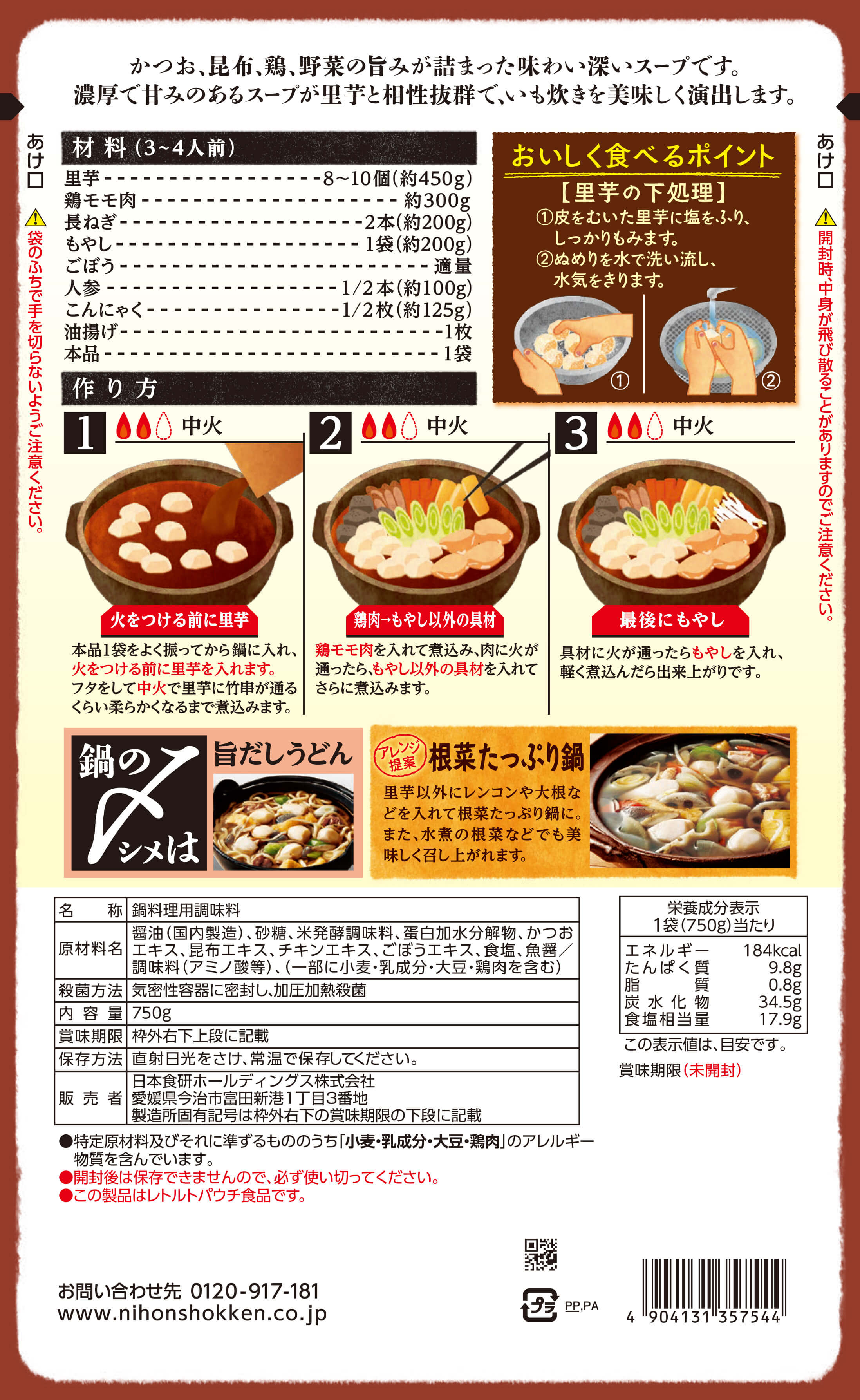 醤油(国内製造)、砂糖、米発酵調味料、蛋白加水分解物、かつおエキス、昆布エキス、チキンエキス、ごぼうエキス、食塩、魚醤/調味料(アミノ酸等)、(一部に小麦・乳成分・大豆・鶏肉を含む)