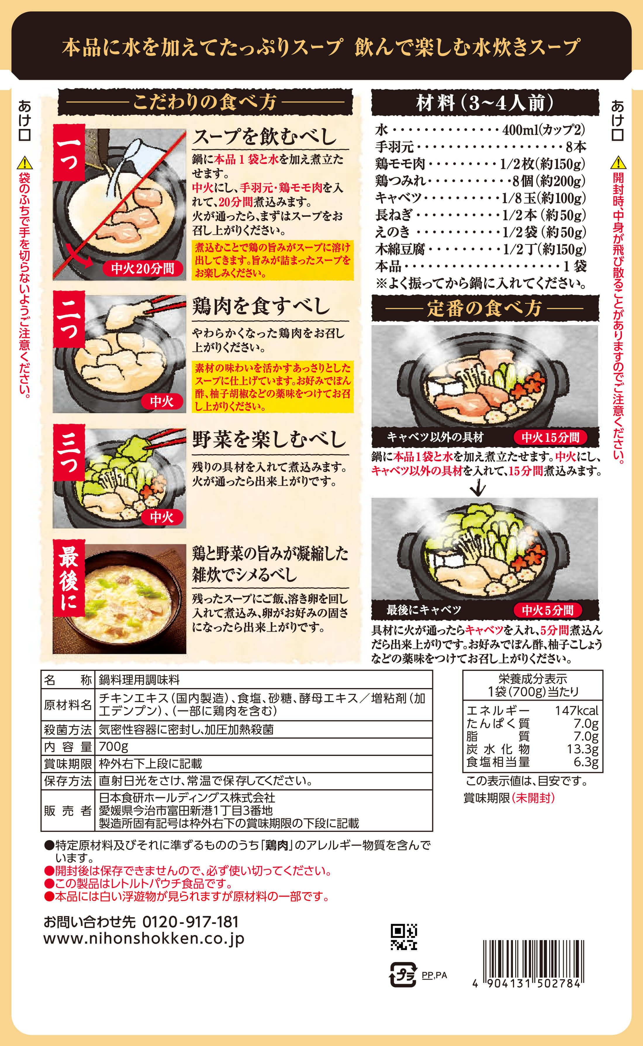チキンエキス(国内製造)、食塩、砂糖、酵母エキス/増粘剤(加工デンプン)、(一部に鶏肉を含む)