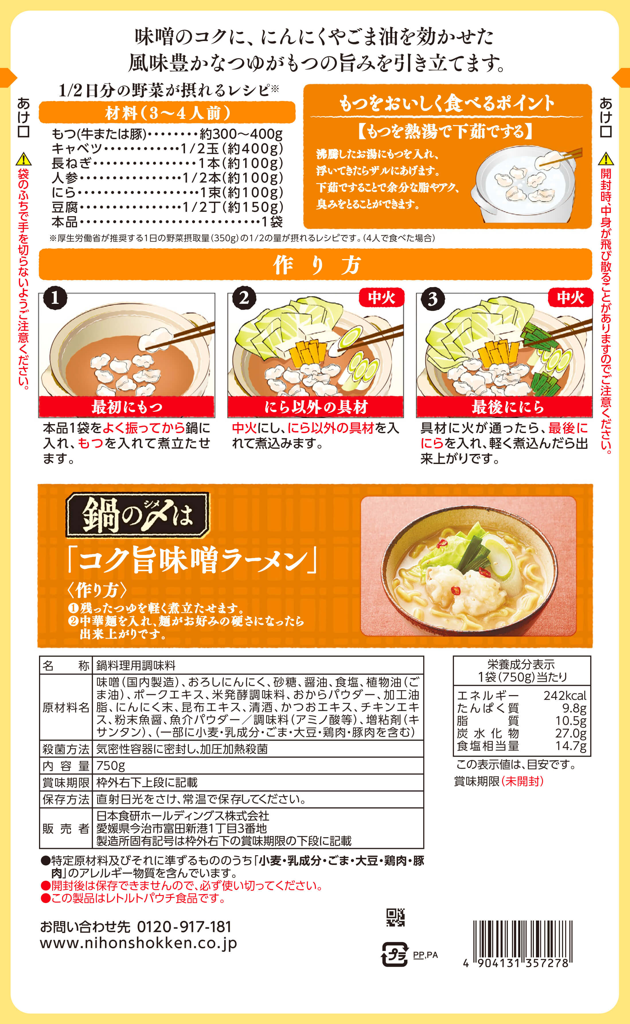 醤油(国内製造)、蛋白加水分解物、酒粕、砂糖、かつおエキス、米発酵調味料、食塩、おろしにんにく、味噌、ねぎエキス、魚介パウダー、酵母エキス、清酒、粉末魚醤、昆布エキス、唐辛子/調味料(アミノ酸等)、増粘剤(キサンタン)、甘味料(ステビア、カンゾウ)、酸味料、(一部に小麦・乳成分・さば・大豆を含む)