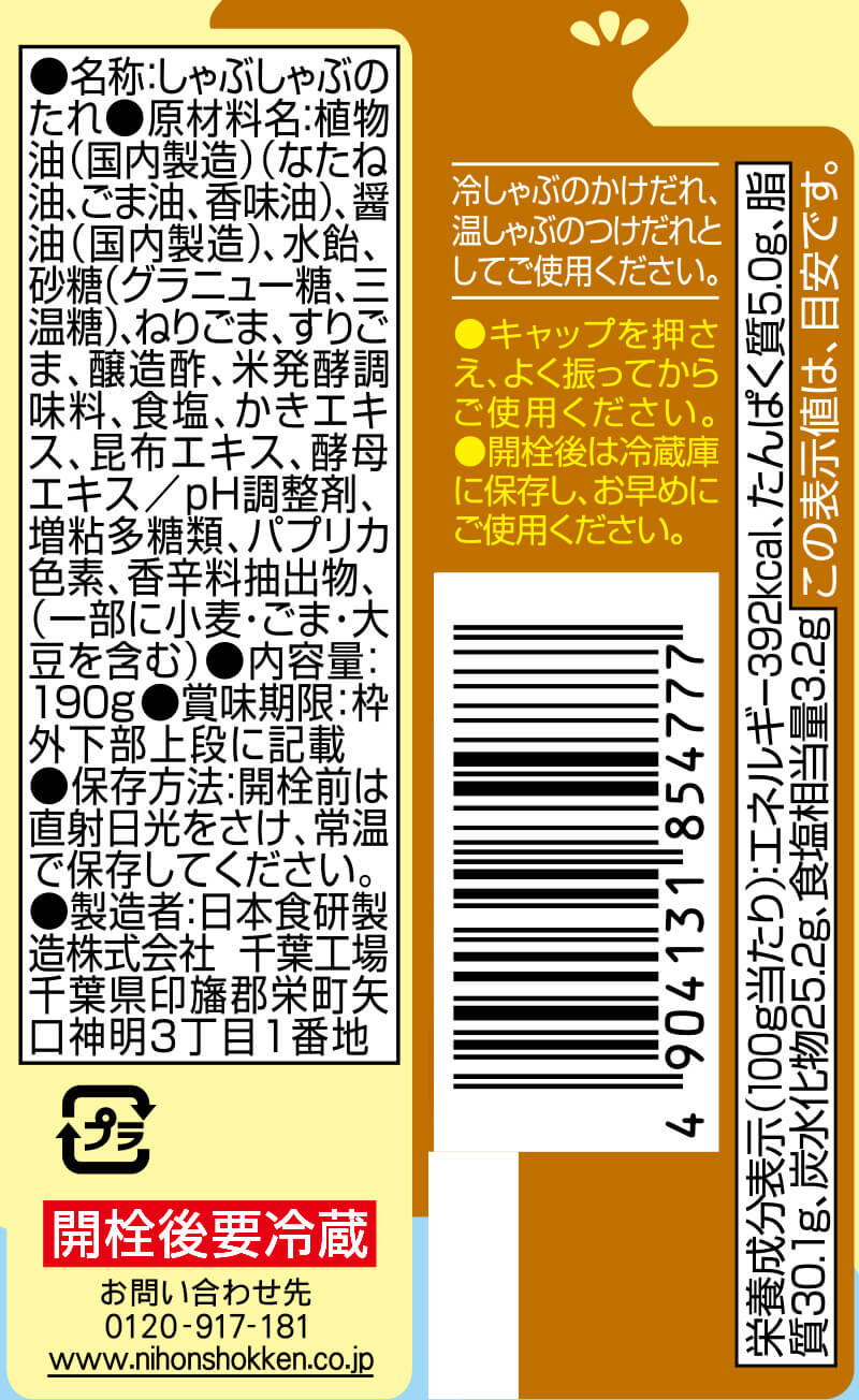 植物油(国内製造)(なたね油、ごま油、香味油)、醤油、水飴、砂糖(グラニュー糖、三温糖)、ねりごま、すりごま、醸造酢、米発酵調味料、食塩、かきエキス、昆布エキス、酵母エキス/pH調整剤、増粘多糖類、パプリカ色素、香辛料抽出物、(一部に小麦・ごま・大豆を含む)